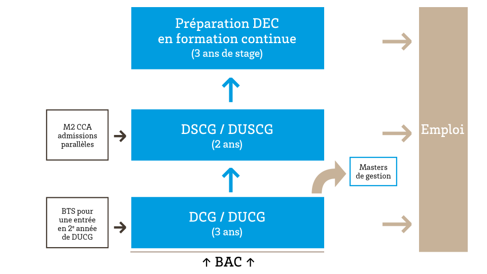 Le titulaire du DCG peut se présenter aux épreuves du diplôme supérieur de comptabilité et de gestion (DSCG) dont la possession après 2 années d’étude permet d'accéder au stage d'expertise comptable (DEC) qui s’étale sur 3 années.