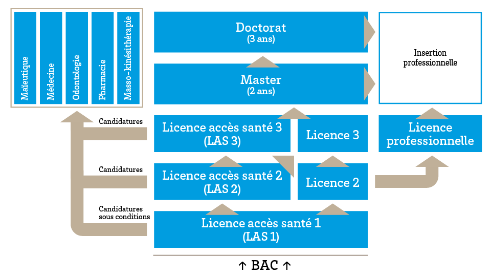 Pour les filières médicales (MMOP), il est fortement conseillé de candidater à partir de la LAS2 et LAS3. - Après la deuxième année de LAS, candidature en MMOP-K ou poursuite en licence professionnelle (1 an) pour obtenir un Bac+3